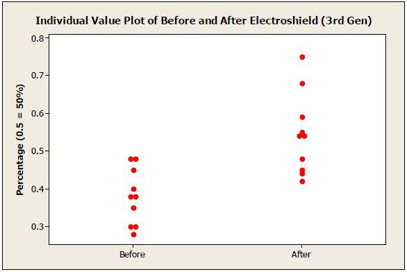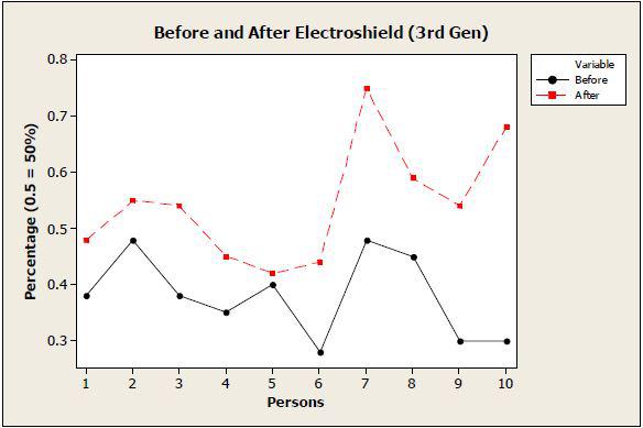 The below graph shows the difference in test subjects both before and after exposure to Electroshield. There is an obvious clear increase in organ function.